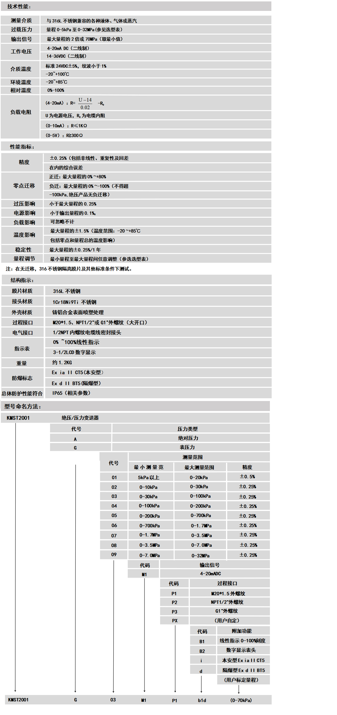 KMST2001系列绝压/压力变送器选用著名的美国NovaSensor公司高精度、高稳定性扩散硅隔离式传感器组件,通过高可靠性的放大电路及精密温度补偿,将被测介质的绝压或表压转换成4~20mADC标准电信号。精湛的对装技术以及完善的装配工艺确保了该产品的优异质量和最佳性能。该产品具有品种规格齐全、接口形式规范、零点及量程调节方便等特点,能够最大限度的满足客户的需要。KMST2001系列绝压/压力变送器分普通型、本质安全防爆型和隔爆型三种型式,本质安全防爆型和隔爆型产品能广泛应用于工业现场中的各种恶劣及危险场所。