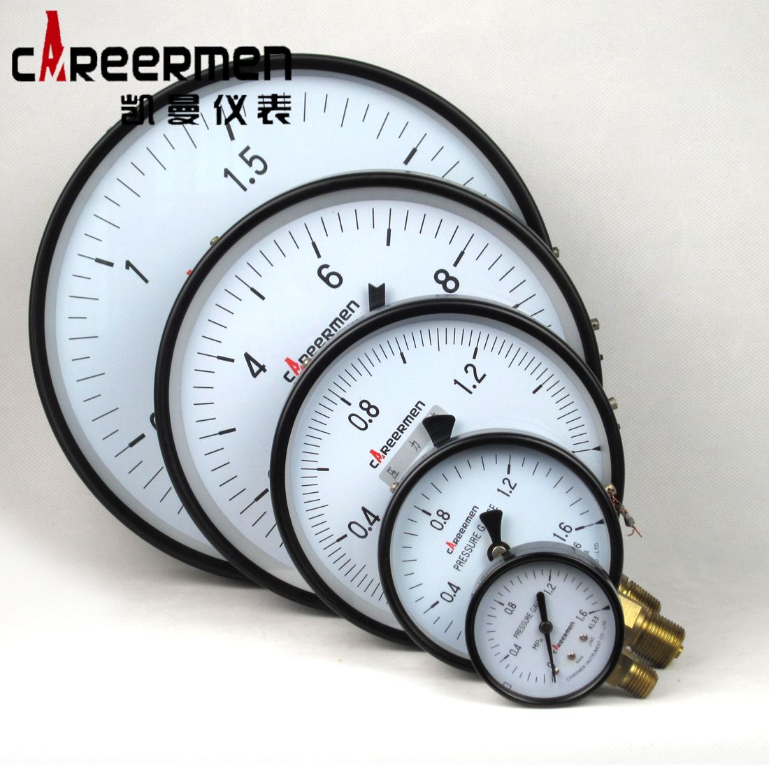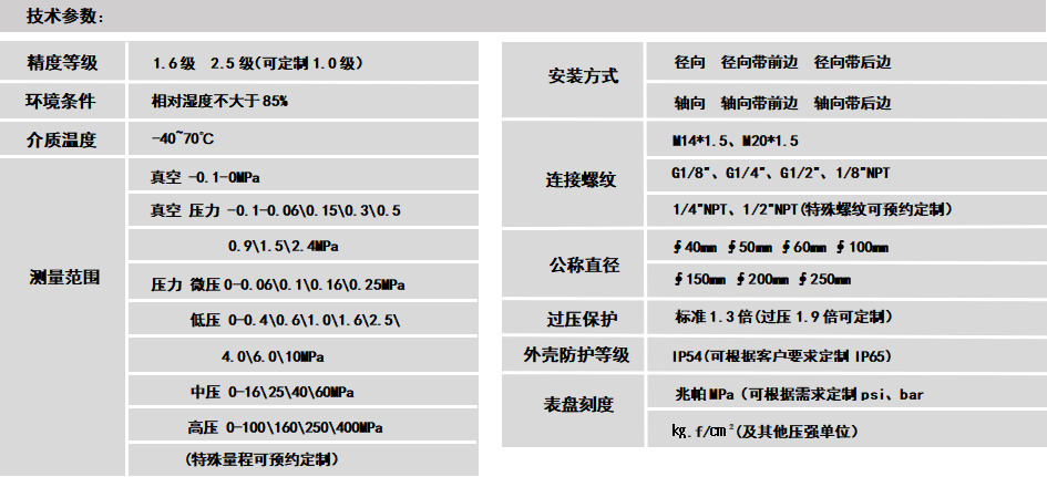 一般压力表(General Pressure Gauge)概述:一般压力表系列是最基础的压力表类型,用于测量无爆炸危险,不结晶,不凝固,且对铜及铜合金不起腐蚀作用的液体、气体和蒸汽的压力或真空。 其系列完整、结构简单、性能可靠、指示直观、造价低廉,是应用最为广泛的一种压力表。 典型的应用场所为:空气压缩机、真空泵、工艺管路、调压阀、测试设备等。