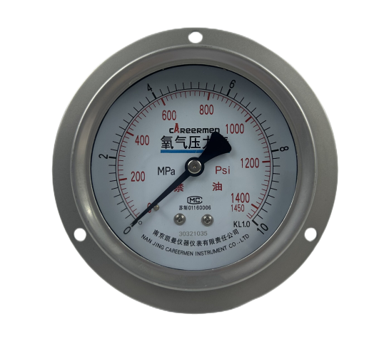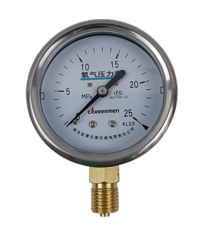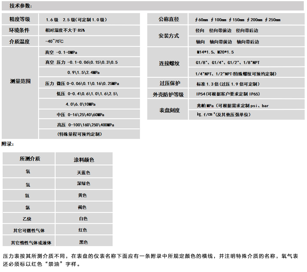 气体压力表仪表适用测量氧气、乙炔、氮气、氢气、二氧化碳、氩气、沼气、氯气、氨气等气体介质的压力。属于专用压力表,根据需要有些要严禁接触油脂类物质(禁油),有些要在表盘上标注特殊标示。