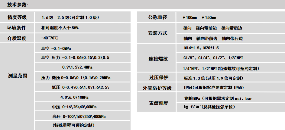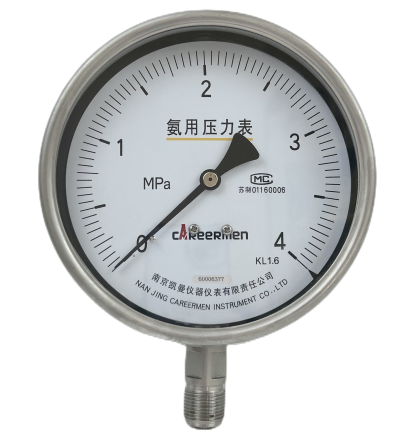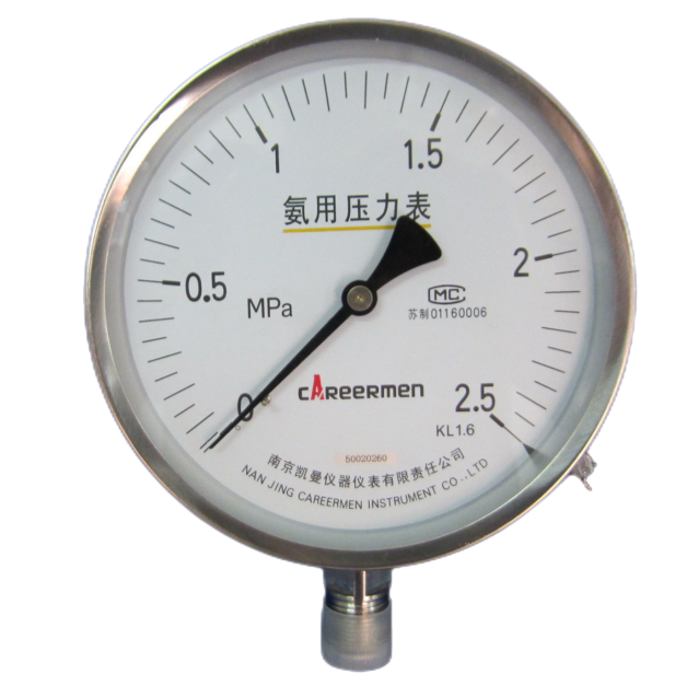 氨用压力表概述:氨用压力表主要用于化工部门或制冷设备中测量氨的气体、液体及其混合物的压力或真空。也可以代替一般压力表使用。根据客户对质量的不同要求,可以生产全不锈钢测量元件的氨用压力表。如果被测介质的压力有强烈脉冲变化或压力冲击、在生产工艺中经常突然卸荷的场合、以及环境震动较大的场所,则需要选用耐震氨用压力表,能测量气体、液体脉动压力的平均值,以克服介质强烈脉冲及环境震动对仪表带来的损害,确保读数的准确性。