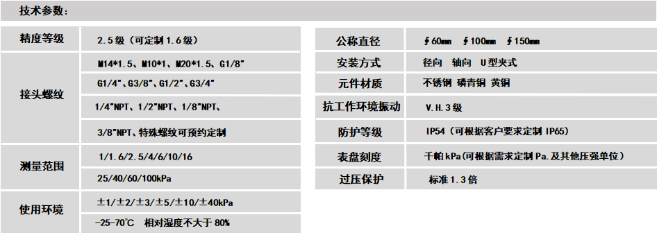 1.不锈钢防腐型、充油耐震型适用于各种测量环境;