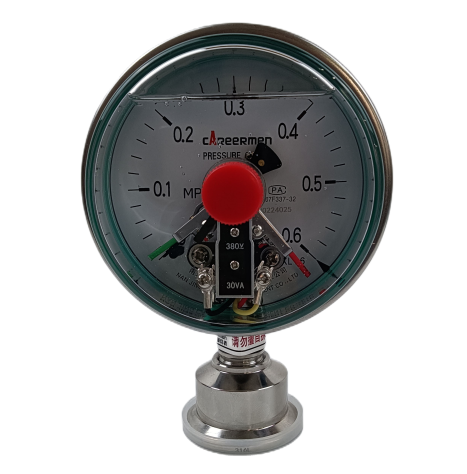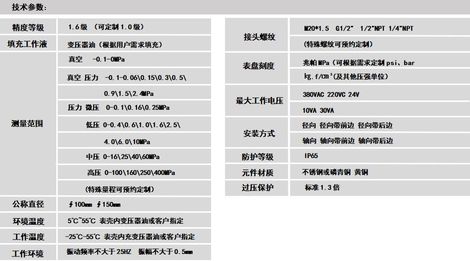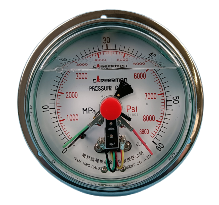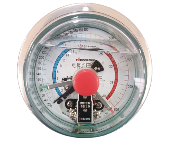 耐震电接点压力表概述:耐震电接点压力表具有抗介质脉动和冲击载荷,耐环境振动等优异特性,适用测量对铜和铜合金无腐蚀性的气体,液体或蒸汽等压力。仪表设上、下限二位开关型接点装置,在压力达到设定值时发出信号或通断控制电路,供作业系统自动控制或发讯用。其抗振结构可有效抑制指针的抖动、冲击,保护接点,使仪表指示清晰,电信号切换可靠,工作稳定。广泛应用于机械、化工、石油、冶金、电力等工业生产过程。