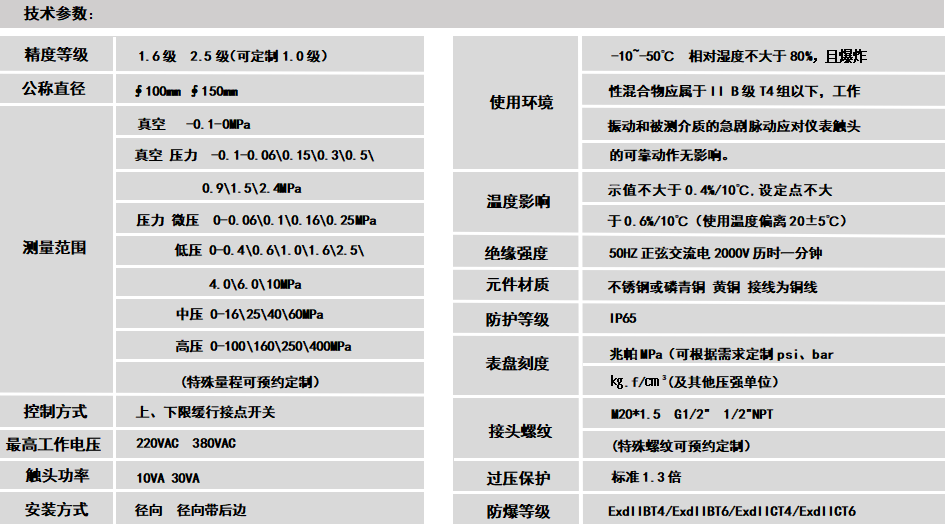 防爆电接点压力表系按国家标准:GB/T1226~2001《一般压力表》国家标准;GB3836. 1~2000《爆炸性气体环境用电气设备第一部分:通用要求》;GB3836. 2~2000《爆炸气体环境用电设备第9部分:隔爆型“d”》的有关规定及JB/T9773~1999《电接点压力表》行业标准规定设计、制造。