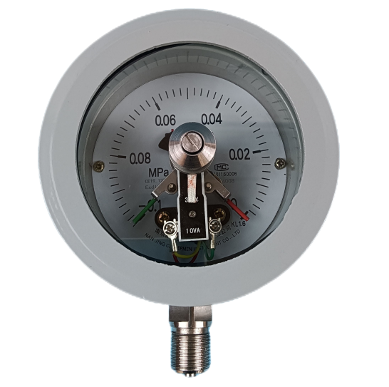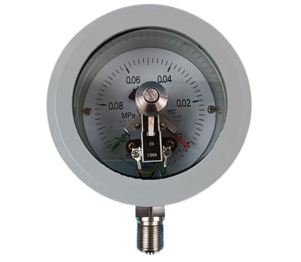 防爆电接点压力表结构原理:仪表由测量系统、指示装置、电接点装置、外壳、调节装置及接线盒等组成。当被测压力作用于弹簧管时,其末端产生相应的弹性变形—位移,经传动机构放大后,由 指示装置在表盘上指示出来。同时指针带动电接点装置的活动触点与设定指针上的触头(上限或下限)相接触的瞬时,致使控制系统接通或断开电路,以达到自动控制和发信报警的目的。