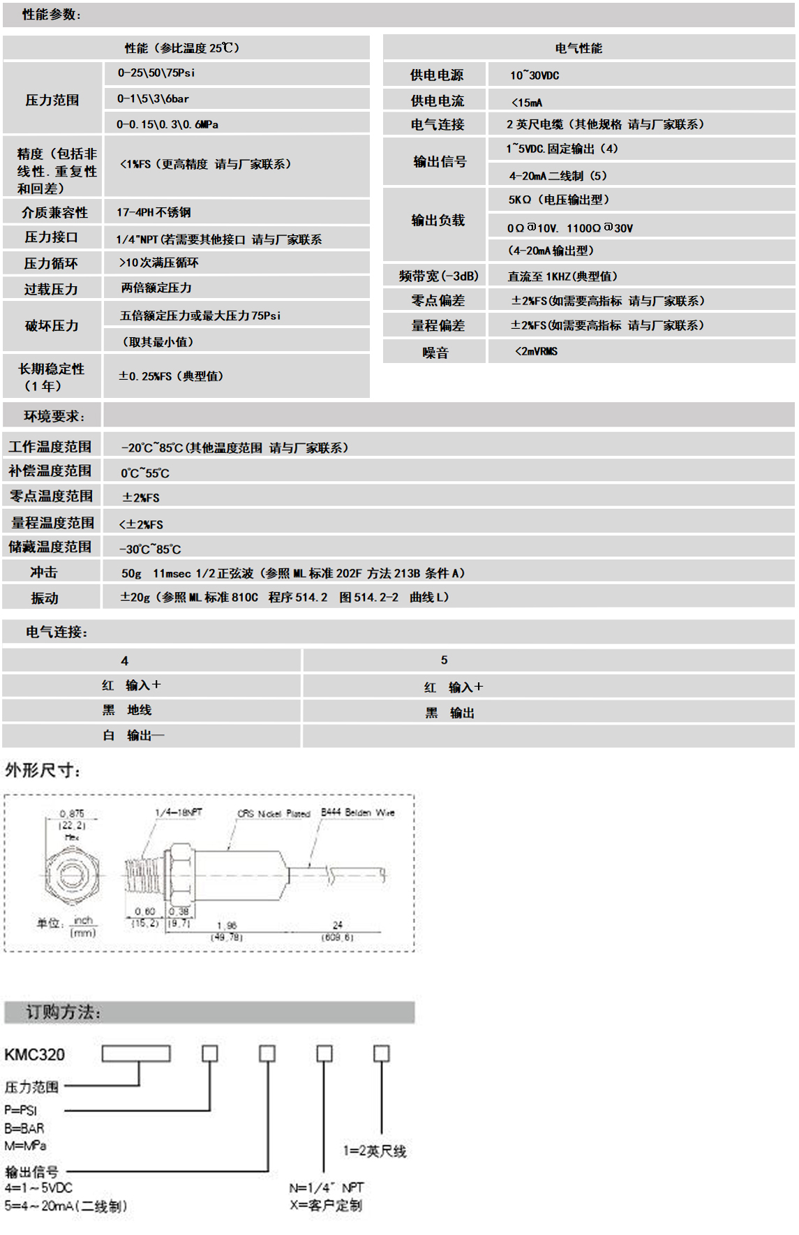KMC320系列不锈钢压力传感器用途:KMC320系列不锈钢压力传感器为大批量,低成本,民用及工业用产品建立了新的性能价格比典范。广泛适用于对气压,液压的检测,甚至较恶劣的介质环境。如污水,蒸汽,轻度腐蚀性液体和气体。本产品的压力腔由一块单件17—4PH不锈钢加工而成。其标准压力接口采用1/4”NPT外螺纹接头,因而可以保证较好的密封性能。