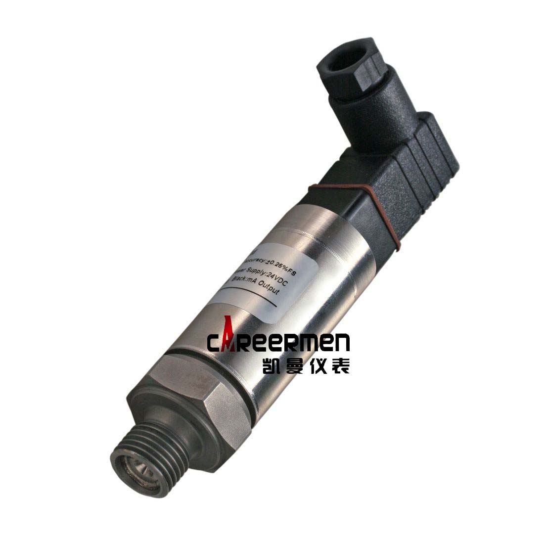 KMC320系列不锈钢压力传感器简介:能感受规定的被测量介质的压力,并按照一定的规律转换成可用输出信号的器件或装置。通常由敏感元件和转换元件组成。当输出为规定的标准信号时(如4~20mA、0~10VDC),则一般称变送器。被测量为压力时称不锈钢压力传感器或不锈钢压力变送器。