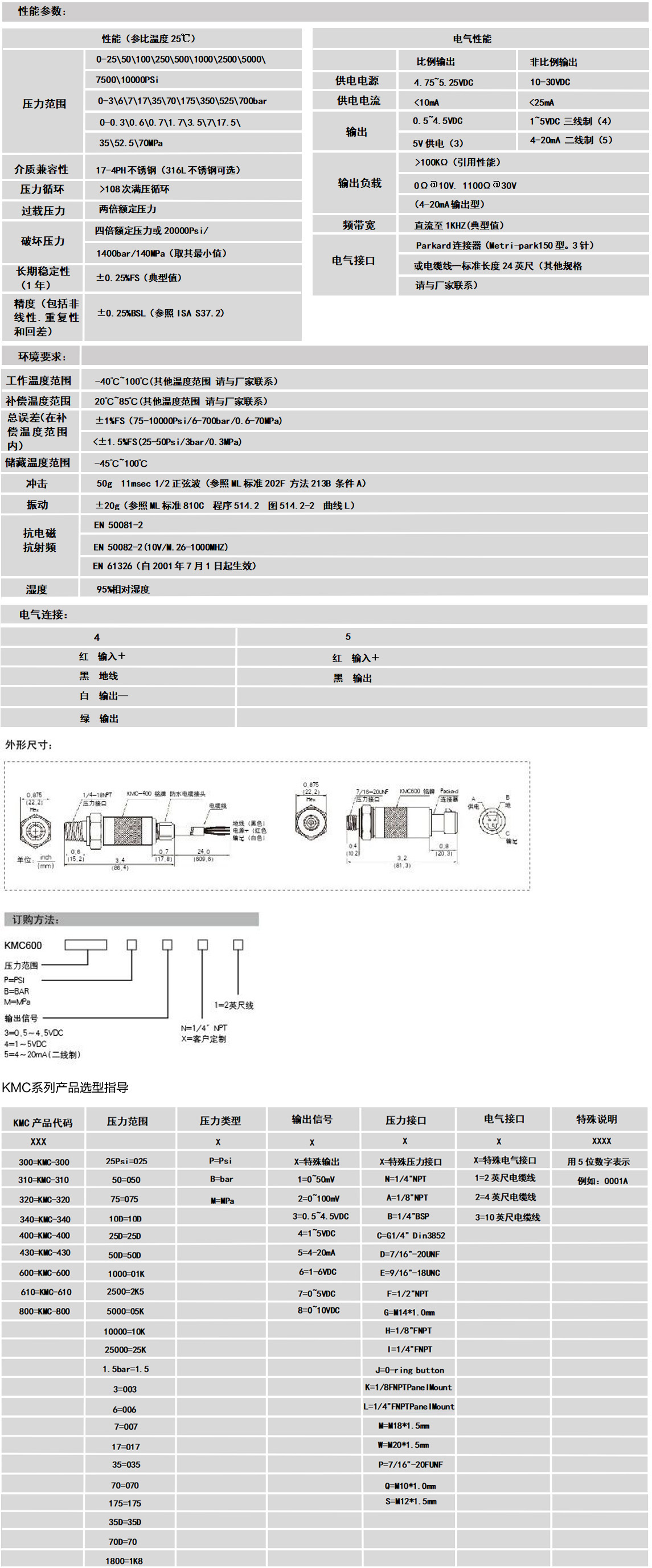 KMC600系列压力传感器概述:KMC600系列压力传感器为大批量、低成本、民用及工业用产品建立了新的性能价格比规范。本系列产品广泛适用于对气压、液压的检测,甚至较恶劣的介质环境,如污水、蒸汽、轻度腐蚀型液体和气体。本产品的压力腔采用17-4PH不锈钢单间一体式结构加工而成。其标准压力接口采用1/4”NPT外螺纹接头,因而可以保证较好的密封性能。