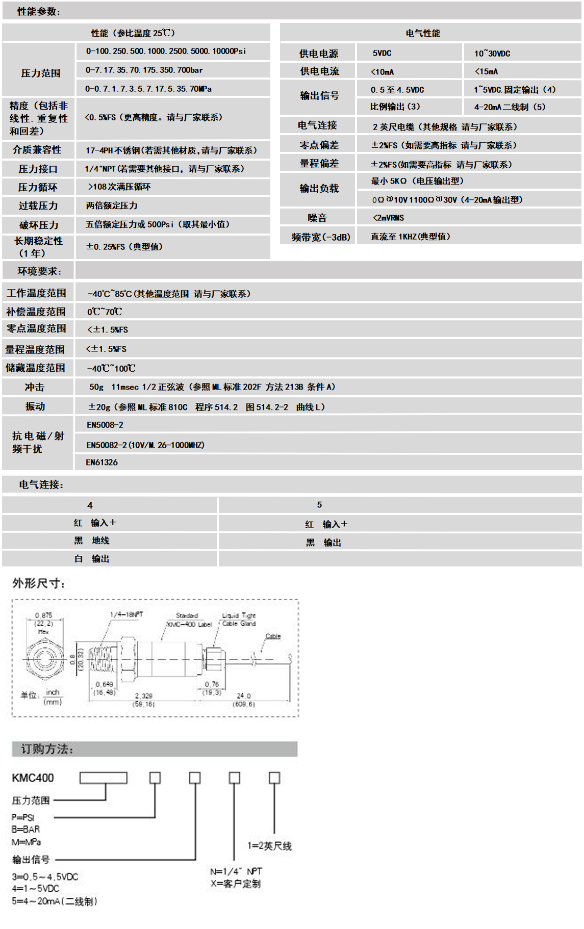 KMC400系列压力传感器为大批量、低成本、民用及工业用产品建立的新的性能价格比典范。本系列产品广泛适用与对气压、液压的检测、甚至较恶劣的介质环境,如污水、蒸汽、轻度腐蚀性液体和气体。本产品的压力腔采用17- 4PH不锈钢单件一体式结构加工而成。其标准压力接口采用1/4“NPT外螺纹接头,因而可以保证较好的密封性能。