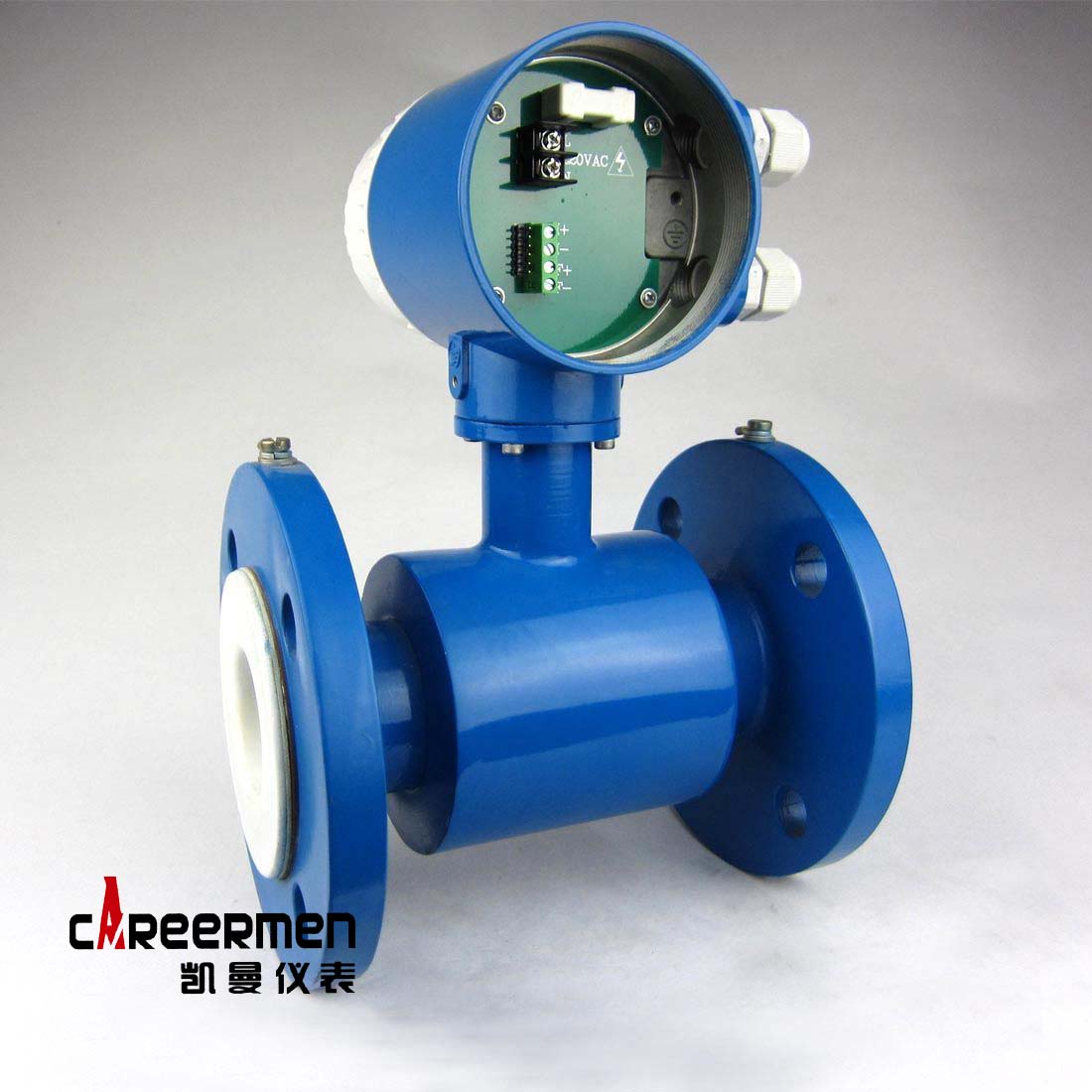 根据法拉第电磁感应原理,在与测量管轴线和磁力线相垂直的管壁上安装了一对检测电极,当导电液体沿测量管轴线运动时,导电液体切割磁力线产生感应电势,此感应电势由两个检测电极检出,数值大小与流量成正比例,其值为: E=KBVD式中: E-感应电势;K-与磁场分布及轴向长度有关的系数;B-磁感应强度;V-导电液体平均流速;D-电极间距;(测量管内直径)传感器将感应电势E作为流量信号,传送到转换器,经放大,变换滤波用一系列的数字处理后,用带背光的点阵式液晶显示瞬时流量和累积流量。转换器有4~20mA输出,报警输出及频率输出,并设有RS485等通讯接口,并支持HART和MODBUS协议。