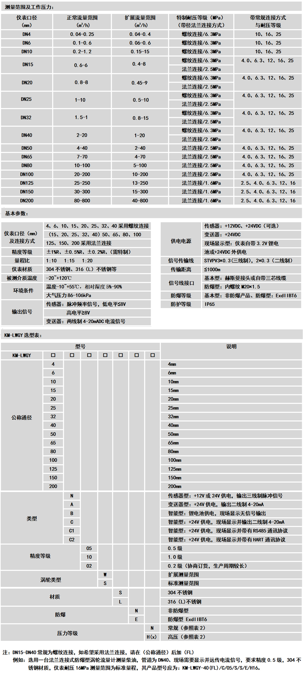 KM-LWGY系列涡轮流量计概述:KM-LWGY系列涡轮流量计是吸取了国内外流量仪表先进技术经过优化设计,具有结构简单、轻巧、精度高、复现性好、反应灵敏,安装维护使用方便等特点的新一代涡轮流量计,广泛用于测量封闭管道中与不锈钢1Cr18Ni9Ti、2Cr13及刚玉AI2O3、硬质合金不起腐蚀作用,且无纤维、颗粒等杂质,工作温度下运动粘度小于5×10-6m2/s的液体,对于运动粘度大于5×10-6m2/s的液体,可对流量计进行实液标定后使用.若与具有特殊功能的显示仪表配套,还可以进行定量控制、超量报警等,是流量计量和节能的理想仪表。