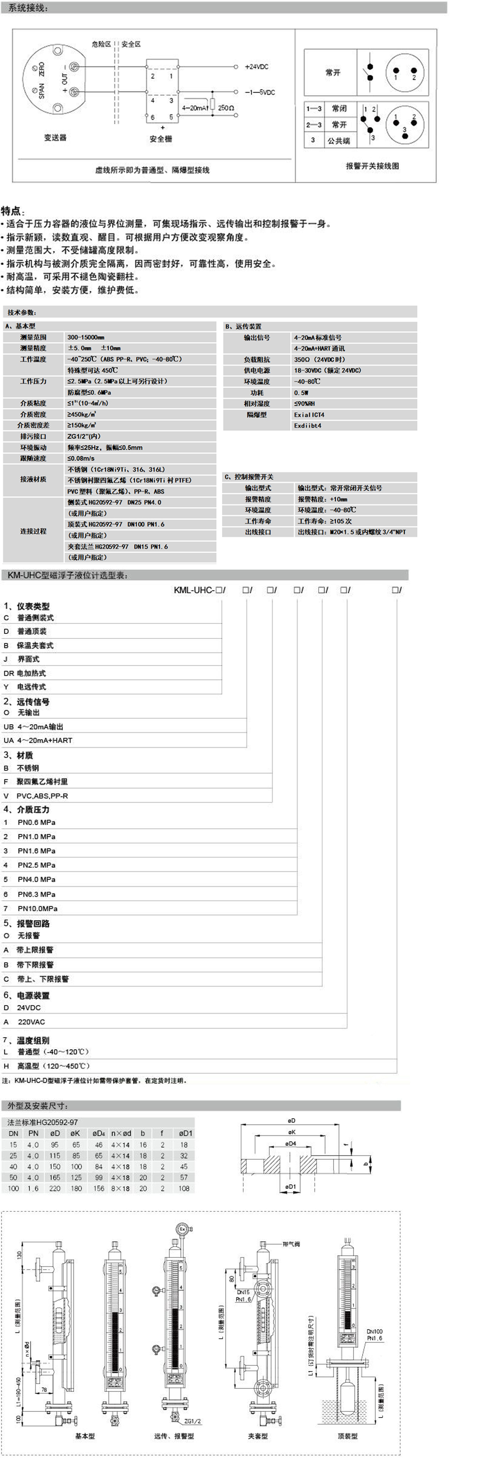 KM-UHC磁性浮子液位计的控制与报警是通过干簧管或水银触点开关,根据液位的给定值动作,从而达到液位报警、控制和事故连锁的目的。