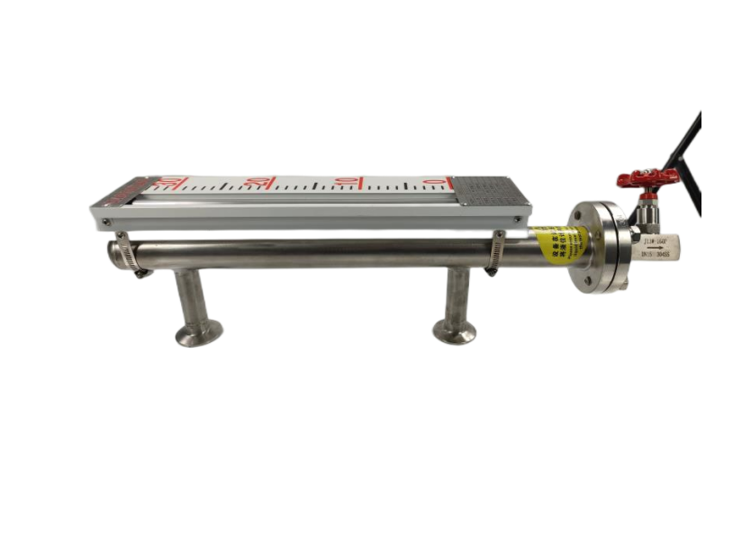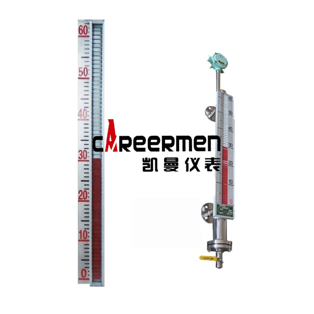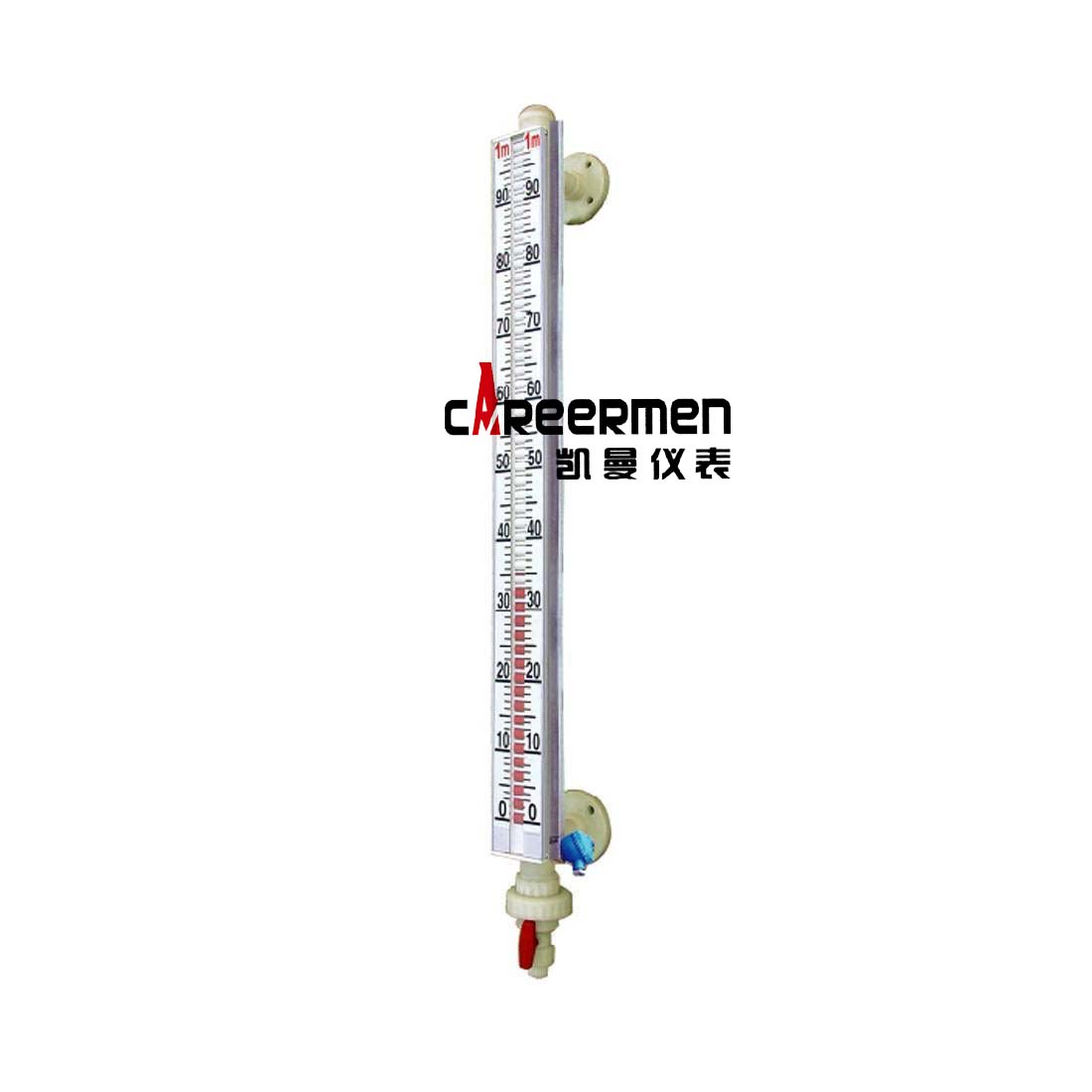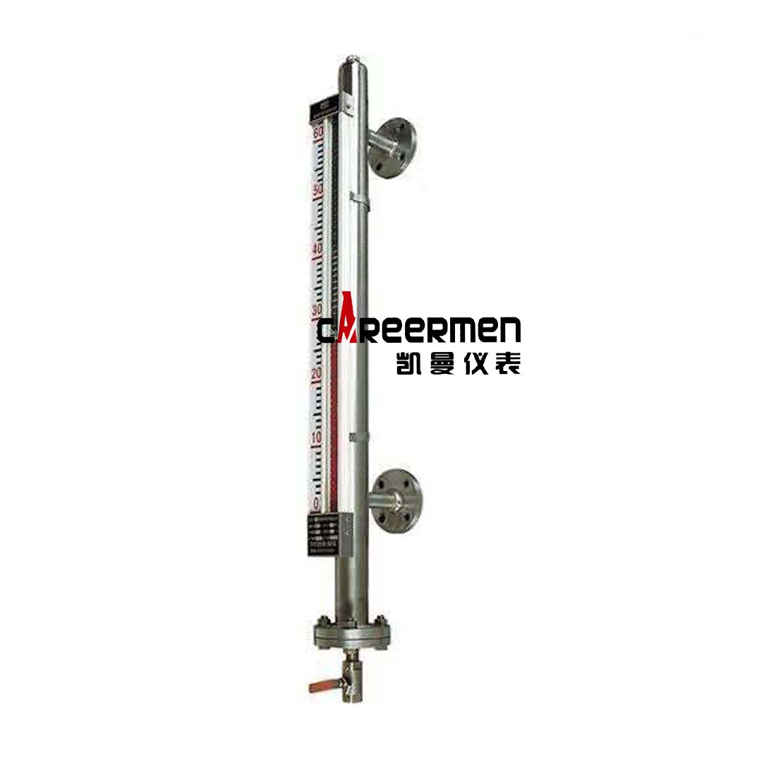 磁浮子液位计概述:KM-UHC型磁性浮子液位计是本公司引进、吸收国外同类产品,并加以吸收、消化、提高,按原化学工业部颁布的磁翻板液位计标HG/T21584-95研制生产的产品。可用于各种塔、罐槽、球形容器和锅炉等设备的介质液位检测。该系列磁浮子液位计可以做到高密封,防泄漏和适应高压高温、腐蚀性条件下的液位测量,具有可靠的安全性,它弥补了玻璃板(管)液位计指示不清晰,易破碎的不足,不受高、低温度剧变的影响,不需多组磁性浮子液位计的组合。全过程测量无盲区,显示醒目、读数直观,且测量范围大。特别是现场指示部分,由于不与液体介质直接接触,所以对高温、高压、高粘度、有毒有害、强腐蚀性介质,更显其优越性。因此,它比传统的玻璃管,板式液位计具有更高的可靠性、安全性、先进性、实用性。由基本型、液位远传装置、液位控制报警开关三部分组成,它是以磁性浮子为感测元件,通过浮子中磁体与色柱中磁体的耦合作用,来反映液位或界面的仪表。基本型与另外两部分的组合即可实现信号远传、液位报警及控制功能。KM-UHC型磁浮子液位计的直观、醒目、性价比高、耐温、耐压、防腐的特点,使磁性浮子液位计广泛应用于电力、石油、化工、冶金、环保等行业生产过程中的液位测量及自动化控制。