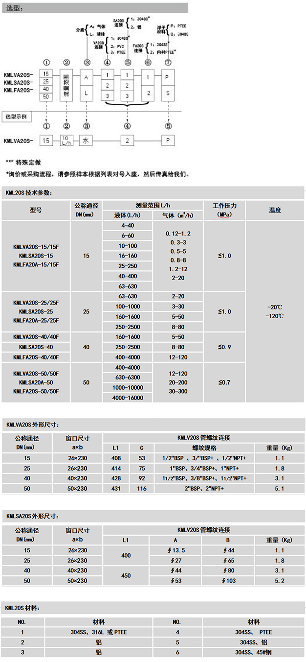20S玻璃转子流量计是我公司的新产品,与同类产品比较具有测量精度高,互换性能好,连接方式多样化,KMLVA20S管螺纹连接,KMLSA20S软管连接,KMLFA20S法兰连接,精度等级互换2.5级,单标1.5级。