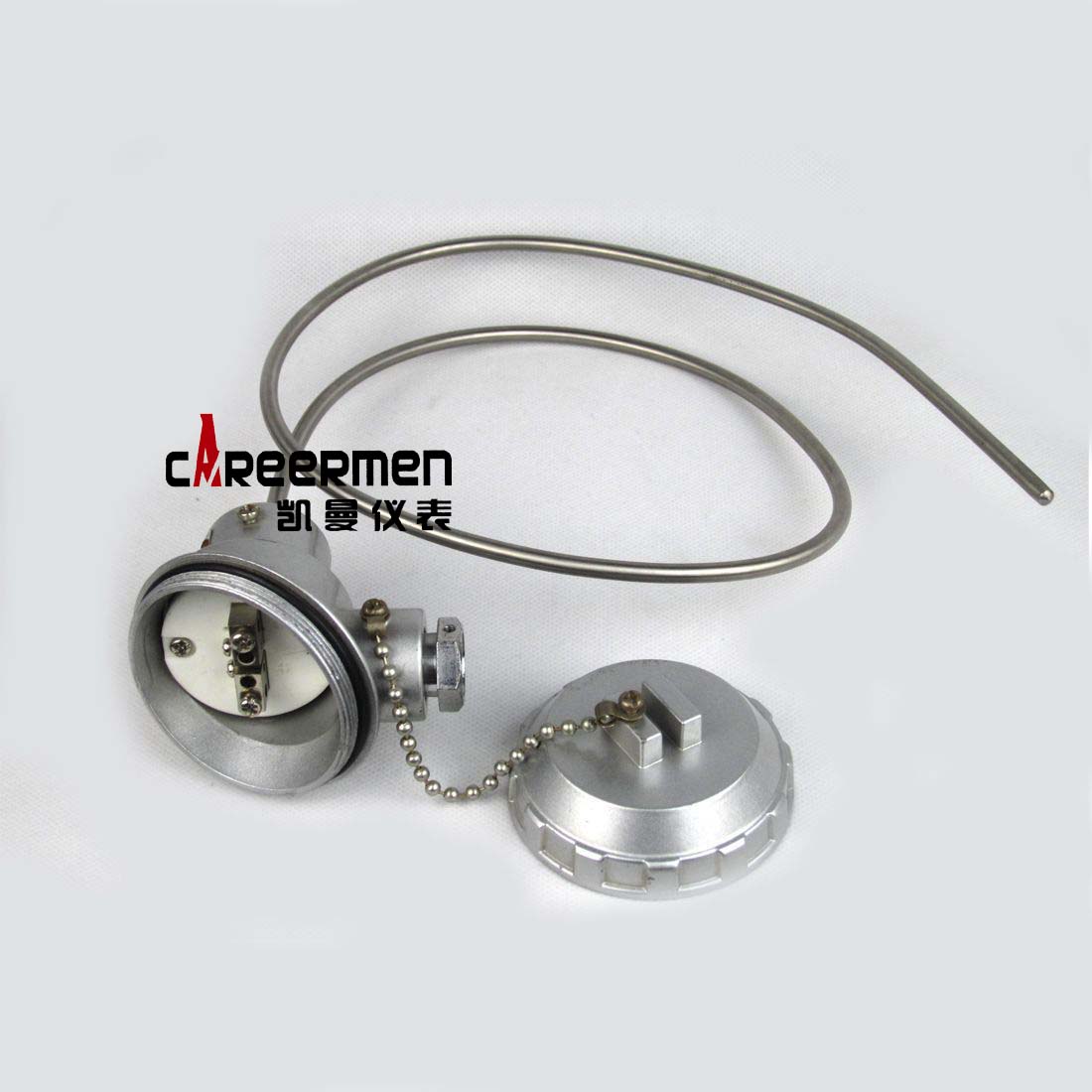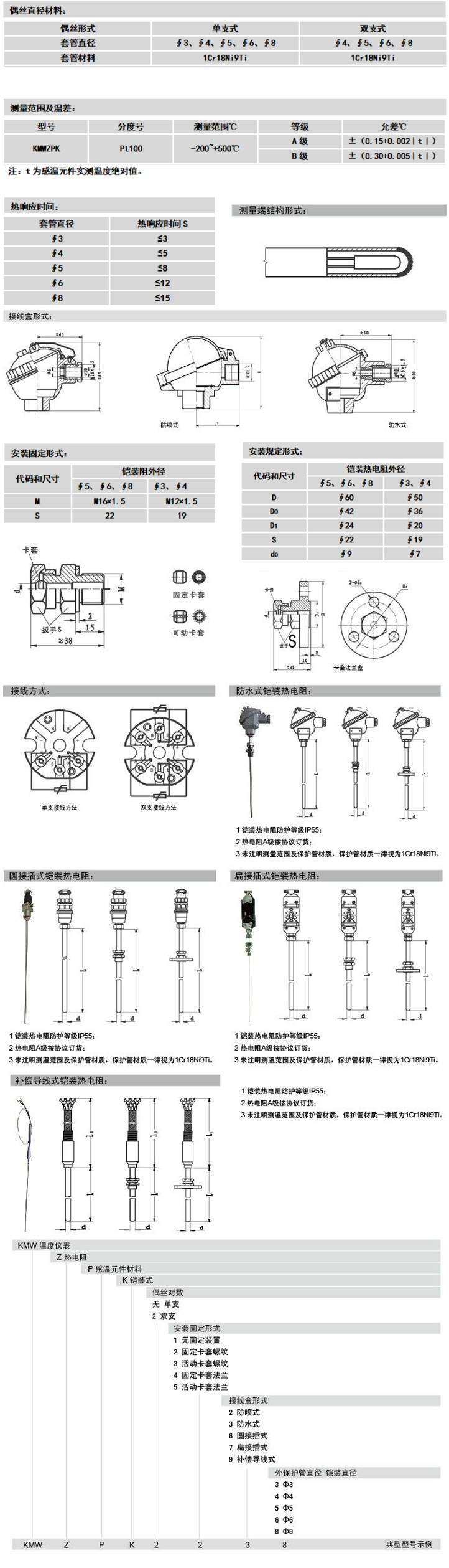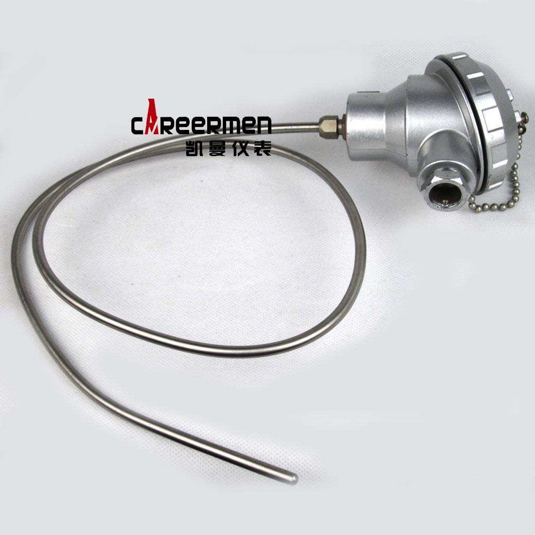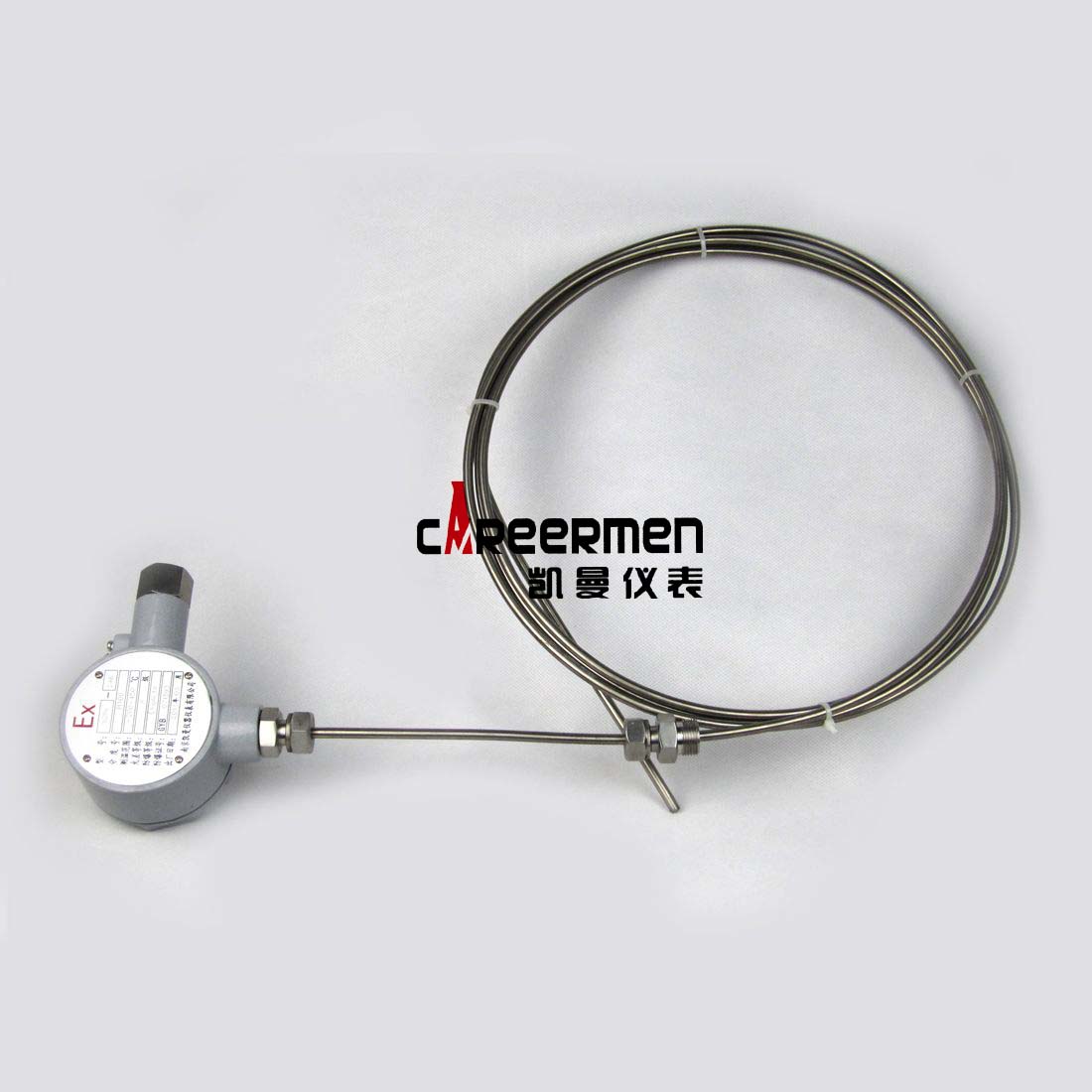 应用:通常和显示仪表、记录仪表、电子计算机等配套使用。直接测量各种生产过程中的-200℃—500℃范围内液体、蒸汽和气体介质以及固体表面温度。 工作原理:铠装热电阻是利用物质在温度变化时,其电阻也随着发生变化的特征来测量温度的。 当阻值变化时,工作仪表便显示出阻值所对应的温度值。